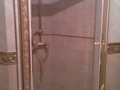 Оба раздельных санузла в квартире в новостройке на Цветном бульваре оформлены в классическом дворцовом стиле. Для поддержания аристократического интерьера мы выбрали круглую ванну на изогнутых ножках, роскошные умывальники с фигурными шкафами и просторный душевой уголок с раздвижной дверкой. Полотенцесушитель и трубы окрашены в благородный бронзовый цвет в тон золотой фурнитуре. В одном санузле установлены напольные унитаз и биде, душевая кабина и рукомойник с тумбой, над которым навешано круглое зеркало в массивной раме. Во втором помещении смонтирована ванна и собран мойдодыр. Отделка стен керамической плиткой двух тонов выполнена по индивидуальному дизайн-проекту. Цена ремонта – 121000 рублей. Стоимость черновых материалов – 28000 руб.