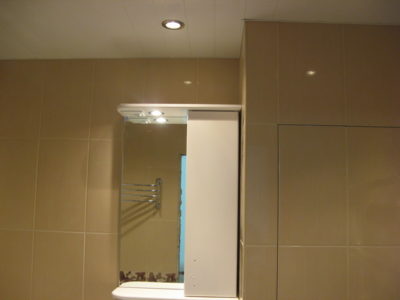 Мы установили унитаз, акриловую ванну с гибким душем, рукомойник со шкафом и зеркалом, а также смонтировали держатели для туалетной бумаги и полотенец. Проведена новая электропроводка и выполнен монтаж электрического полотенцесушителя. Подвесной потолок оформлен пластиковыми панелями со встроенными светильниками. Смета ремонта — 108000 р. Черновые материалы — 36 тыс. руб.