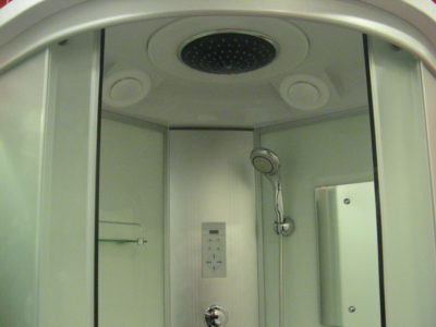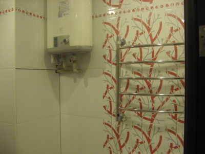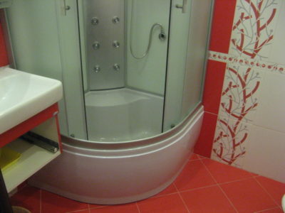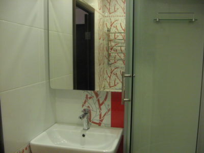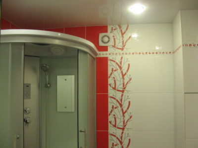 Наша компания выполнила ремонт санузла на улице Юных Ленинцев. Для отделки стен мы выбрали чисто белую керамическую плитку и украшенную ярким фактурным рисунком. На пол уложен кафель насыщенного красного цвета по диагонали. В помещении установлены душевая кабина, унитаз и стиральная машина, смонтированы водонагревательный прибор и подвесной умывальник. В натяжной потолок встроены точечные светильники, а отверстие вентиляционной шахты мы защитили решеткой с принудительной вентиляцией. Смета на ремонт — 112 тыс. руб. Расходы на черновые материалы — 32 тыс. руб.