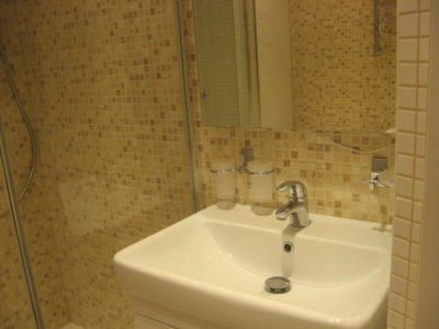 Наша компания выполнила капитальный ремонт совмещенного с ванной комнатой санузла на улице Новочеремушкинская. Для декорирования поверхностей дизайнер выбрала мозаичную плитку двух видов: однотонную и цветную. Благодаря правильно подобранному расположению сантехники малогабаритное помещение выглядит просторным, а за счет теплых оттенков плитки – уютным. В санузле мастера установили полукруглую душевую кабину со стеклянными дверцами и рукомойник с тумбой с правой стороны от входа, а компактный унитаз, полотенцесушитель и стиральную машину – с левой. В подвесной потолок вмонтированы точечные светильники, а на пол уложен кафель светло-бежевого цвета. Цена ремонта – 126 тысячи рублей. Стоимость черновых материалов – 32 тыс. руб