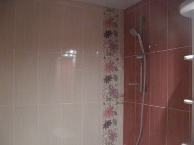 Наша компания выполнила ремонт санузла в городе Видное на улице Школьная. Для облицовки стен мы использовали керамическую плитку нестандартной удлиненной формы бордового и кремового цветов. Такое сочетание позволило зрительно разделить помещение на функциональные зоны. Для нарядности мы выложили вертикальный узор с цветочным орнаментом в двух местах. На пол уложили керамические плиты в тон общему интерьеру. Потолок оформлен пластиковыми панелями. Смонтированы новая ванна с гибким душем, унитаз и мойдодыр с зеркалом. Смета на ремонт составила 98 тысяч рублей. Цена черновых материалов — 31 тыс. руб.