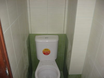 Наша компания выполнила ремонт туалета на улице Юных ленинцев. Мы отошли от принципов классического оформления стен в два цвета и облицевали боковые поверхности белоснежным кафелем. На пол уложена зеленая плитка с фактурным рисунком. С ее помощью также выделена туалетная зона. Защитный экран для коммуникаций замаскирован под общий интерьер. Потолок оформлен пластиковыми панелями со встроенными светильниками. Смета на ремонт — 28 тысяч рублей. Стоимость черновых материалов — 7600 р.