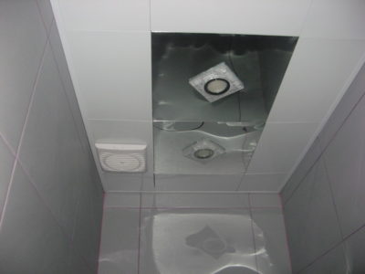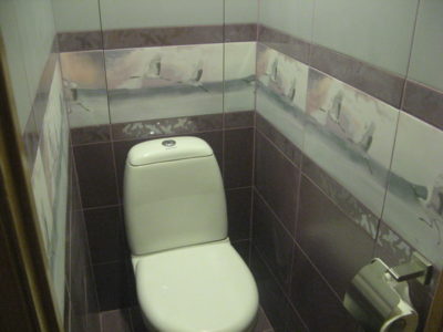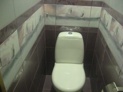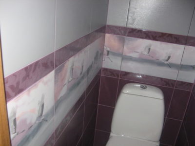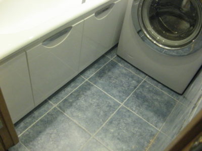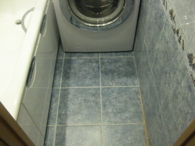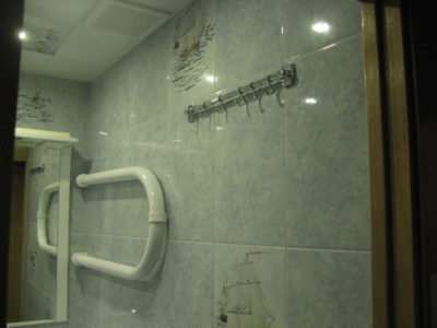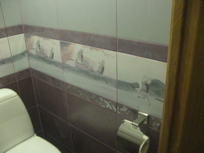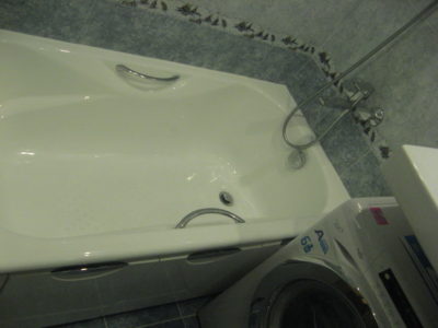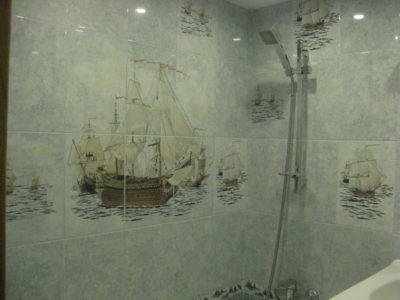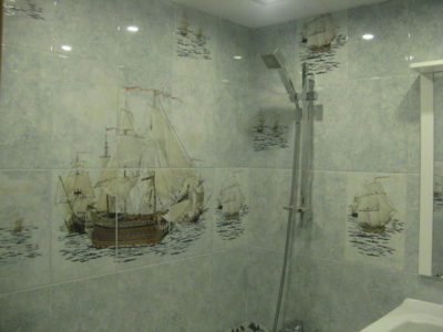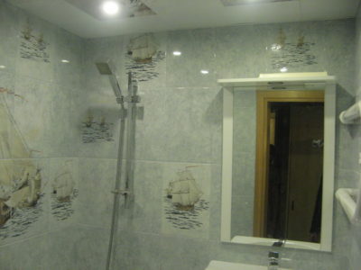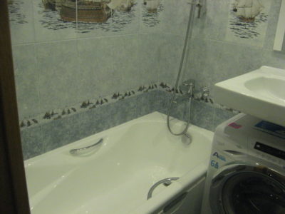 Мы выполнили ремонт ванной комнаты и туалета на улице Свободы. При разработке дизайна была выбрана морская тематика, поэтому для отделки стен и пола использовалась керамическая плита нежно-голубого цвета и кафель с рисунком кораблей. Для усиления эффекта потолок оформлен пластиковыми панелями квадратной формы разного цвета (морской волны и белого). Точечные светильники вмонтированы в потолочную конструкцию. В комнате удалось компактно разместить ванну с гибким душем, стиральную машину, подвесной умывальник, зеркало и крючки для полотенец. В туалете установлен новый унитаз, а в качестве разделительной полосы использовалась керамическая плита с изображением летящих над морем журавлей. Цена ремонта — 125700 руб. Черновые материалы — 32 тыс. руб.