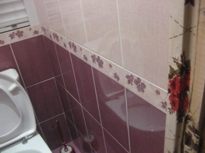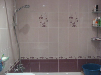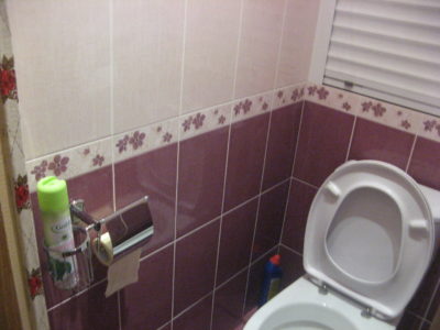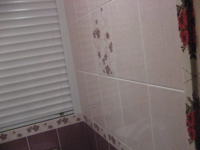 В ходе ремонта ванной комнаты и туалета на улице Гарибальди мастера полностью демонтировали старую сантехнику и отделку, после чего смонтировали новые трубопроводы и выровняли поверхности. Для отделки стен был использован кафель нежно-розового и бордового цвета. В туалете установлен унитаз и держатель для предметов личной гигиены. Сантехнический шкаф скрыт за вертикальными жалюзи. В ванной комнате установлена стандартная ванна и подвесной умывальник. Для душевых шторок и шланга установлен держатели из нержавеющей стали. В подвесной потолок встроены точечные светильники. Вентиляционное отверстие закрыто решеткой. Стоимость ремонта – 123000 рублей. Цена черновых материалов – 30 тыс. 700 руб.