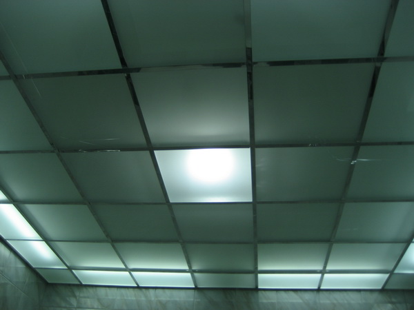 В помещениях мы установили акриловую ванну, мойдодыр и унитаз с функцией биде. Инженерные коммуникации скрыты за защитным экраном. Потолок оборудован стеклянными подвесными панелями, за которыми смонтированы светодиодные лампы.