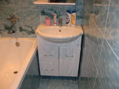 Главным достоинством дизайна при ремонте ванной комнаты в Химках стало декорирование стен керамической плиткой с изображением дельфинов, черепах и других обитателей моря. Мы выполнили отделку стен и пола кафелем нежно-голубого цвета с белыми прослойками. Установили подвесной потолок из пластиковых панелей со встроенными точечными светильниками. Мы смонтировали в комнате ванну с защитным экраном, мойдодыр и электрический полотенцесушитель. Бюджет ремонта составил 64 тысячи рублей. Черновые материалы — 24 тыс. р.